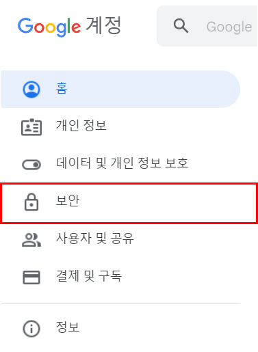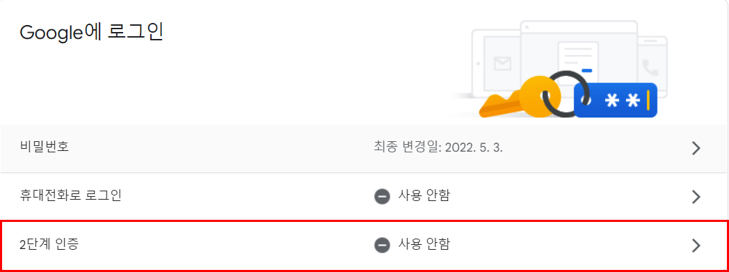 보안 수준이 높은 Gmail 계정을 만들기 위해서는 먼저 2단계 인증을 활성화하여야 합니다. 구글 계정 관리 > 보안 메뉴에 들어가면 아래와 같이 2단계 인증을 사용중인지를 확인할 수 있습니다.