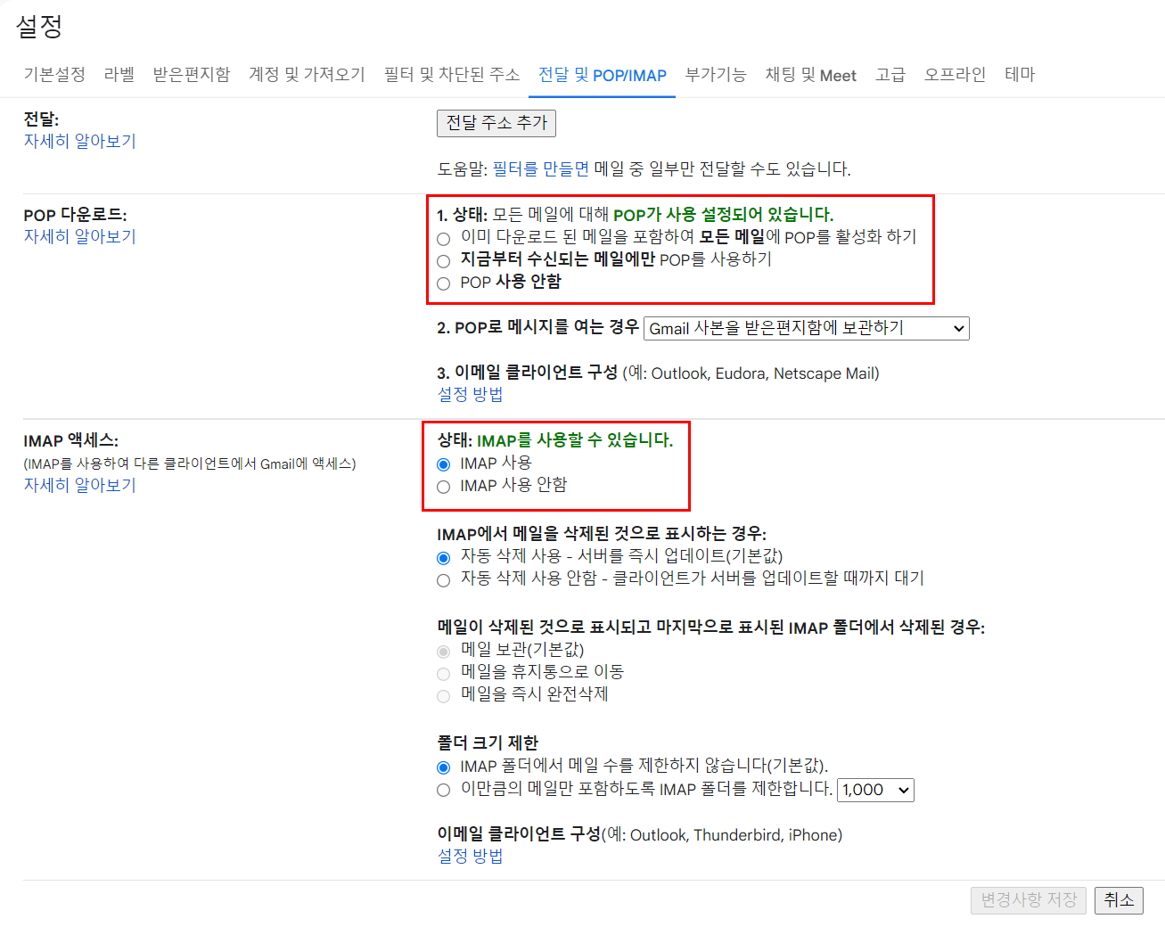 설정 -> 모든설정보기 -> 전달 및 POP/IMAP을 설정해주자