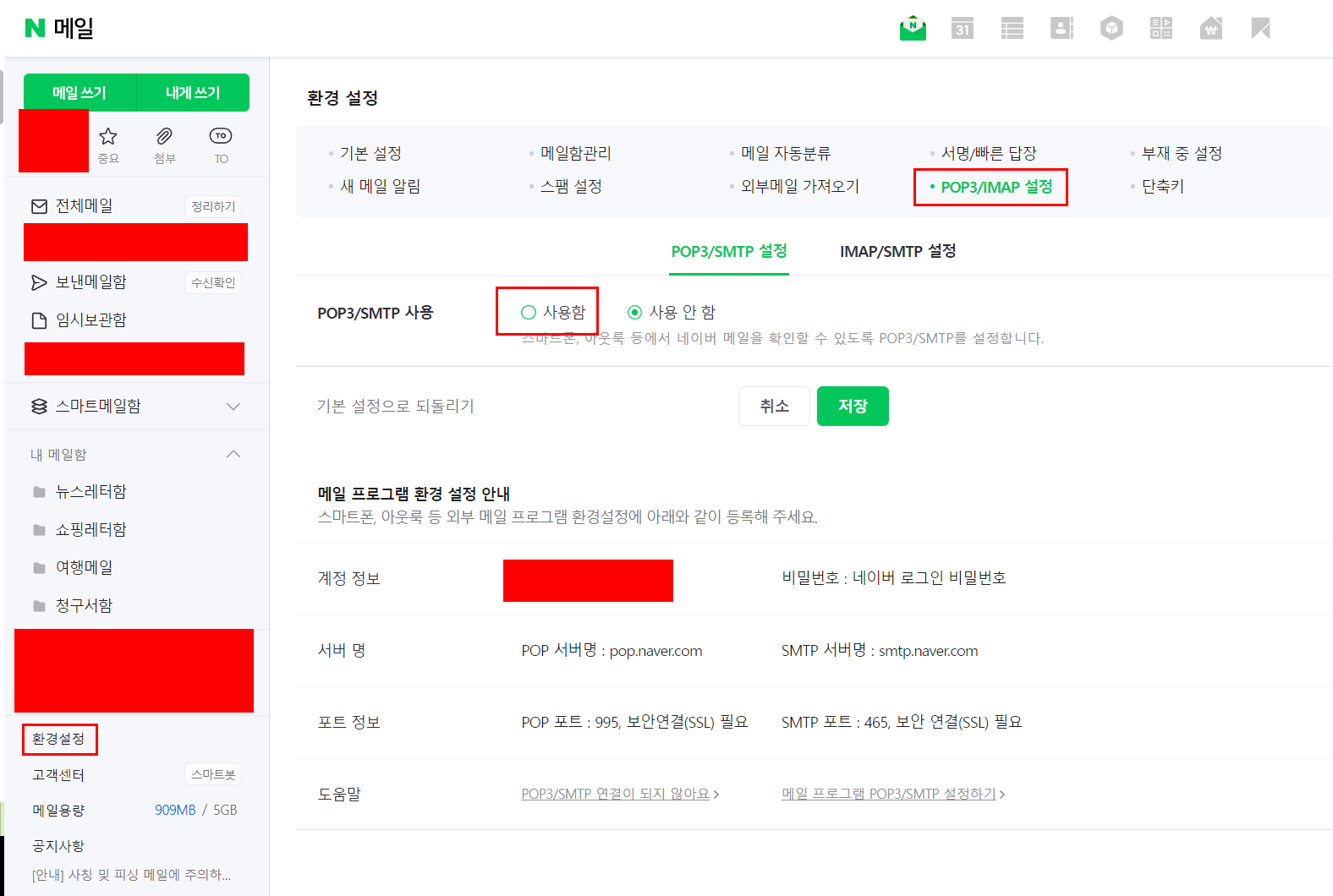 우선 가장먼저 네이버 설정 메일 -> 환경설정에서 설정을 해주면 된다.